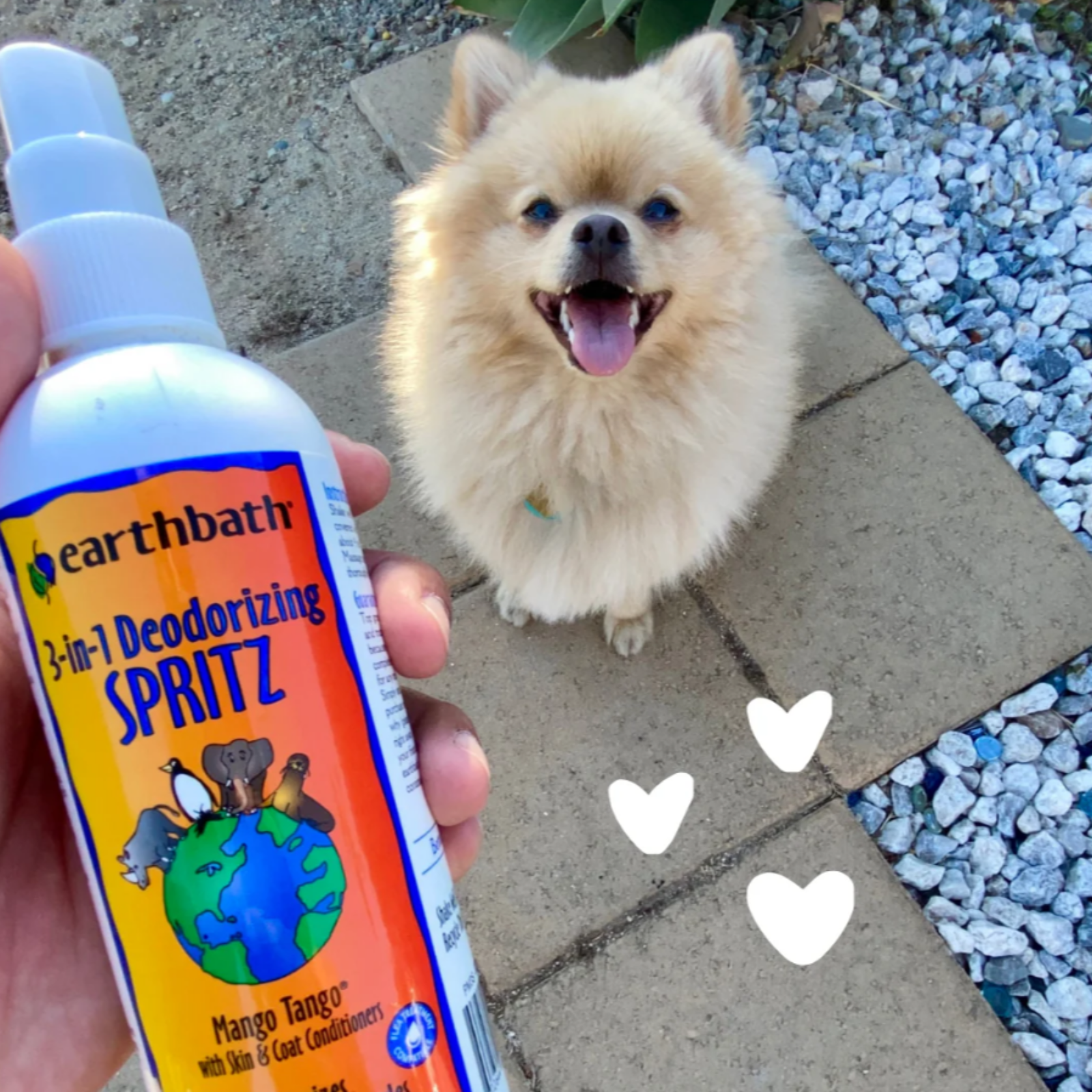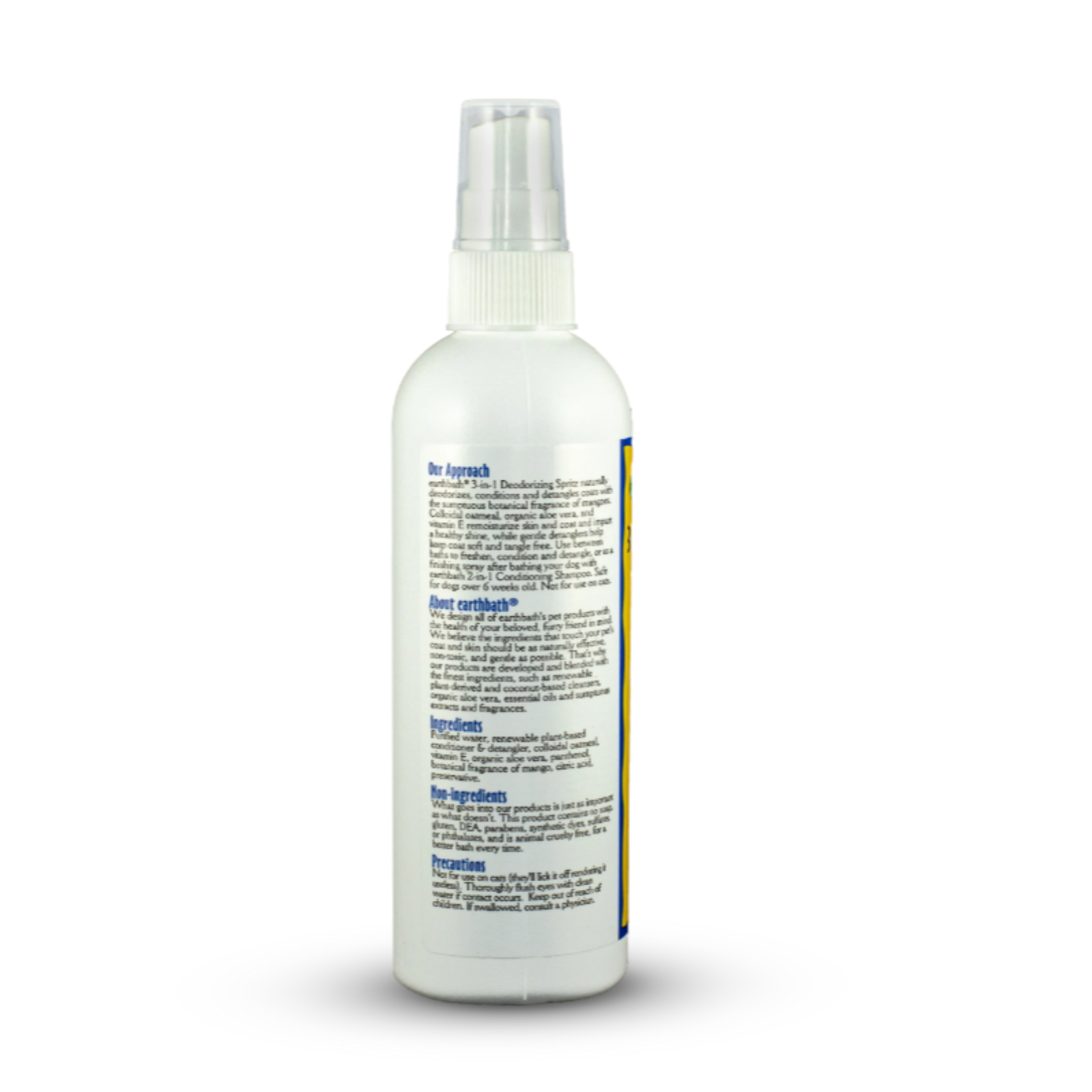 earthbath® 3-in-1 Deodorizing Spritz naturally deodorizes, conditions and detangles coats with the sumptuous botanical fragrance of mangoes. Colloidal oatmeal, organic aloe vera, and vitamin E remoisturize skin and coat and impart a healthy shine, while gentle detanglers help coat soft and tangle free. Use between baths to freshen, condition and detangle, or as a finishing spray after bathing your dog with earthbath® 2-in-1 Conditioning Shampoo. Safe for dogs over 6 weeks old. Not for use on cats.