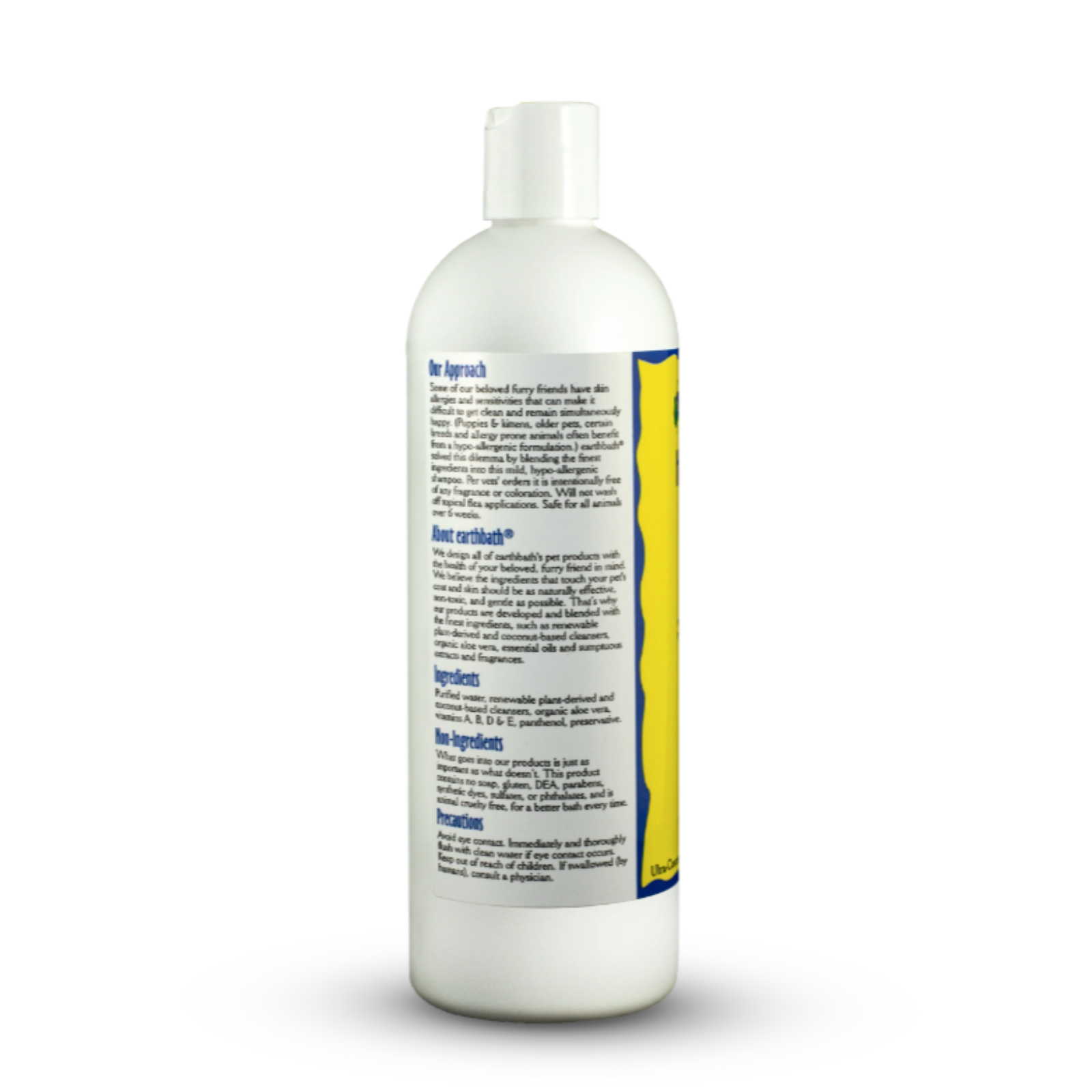 Some of our beloved furry friends have skin allergies and sensitivities that can make it difficult to get clean and remain simultaneously happy. (Puppies & kittens, older pets, certain breeds and allergy prone animals often benefit from a hypo-allergenic formulation.) earthbath solved this dilemma by blending the finest ingredients into this mild, hypo-allergenic shampoo. Per vets' orders it is intentionally free of any fragrance or coloration. Will not wash off topical flea applications. Safe for all animals over 6 weeks.