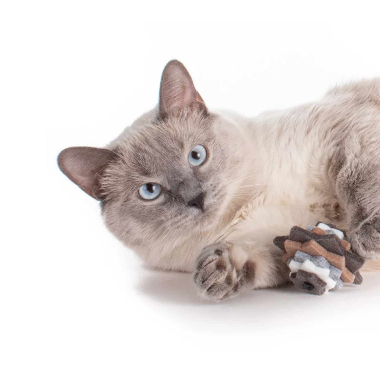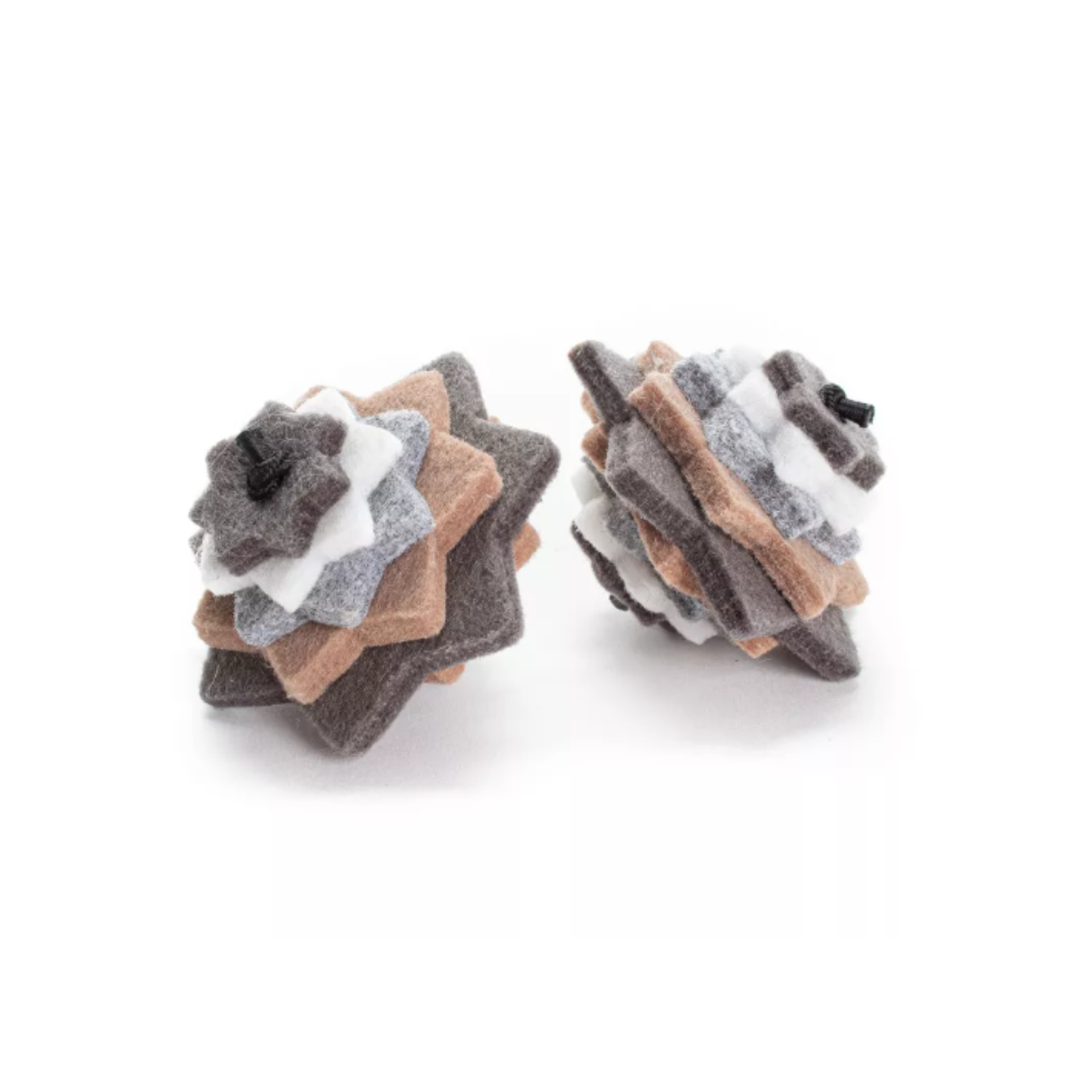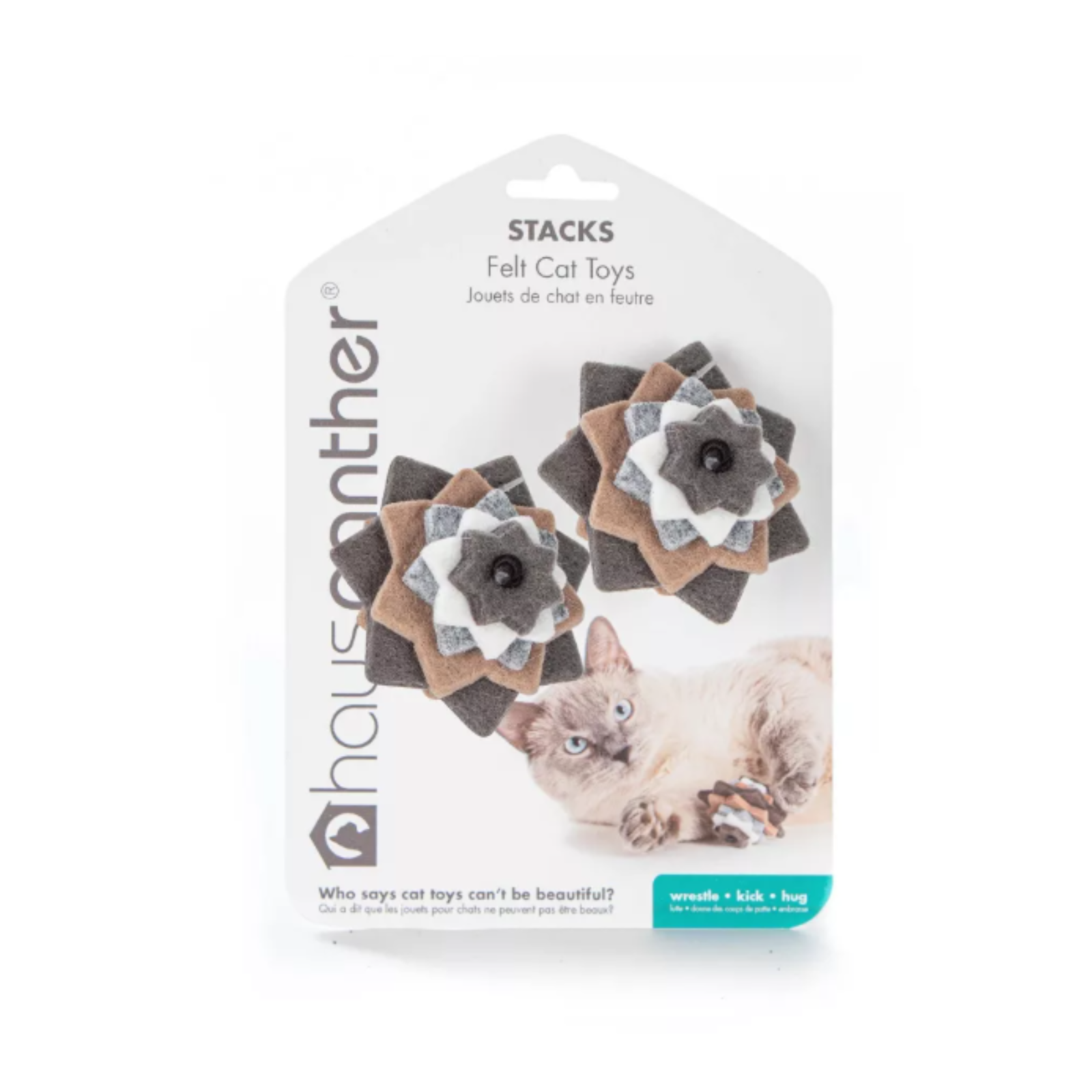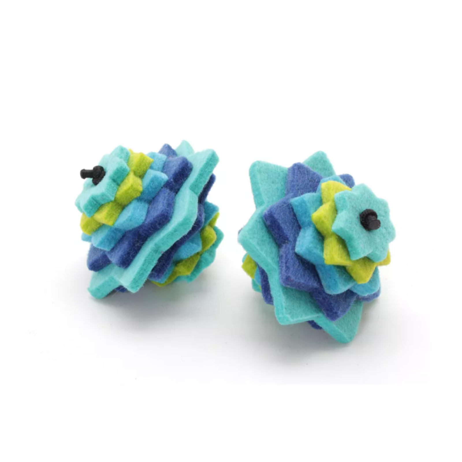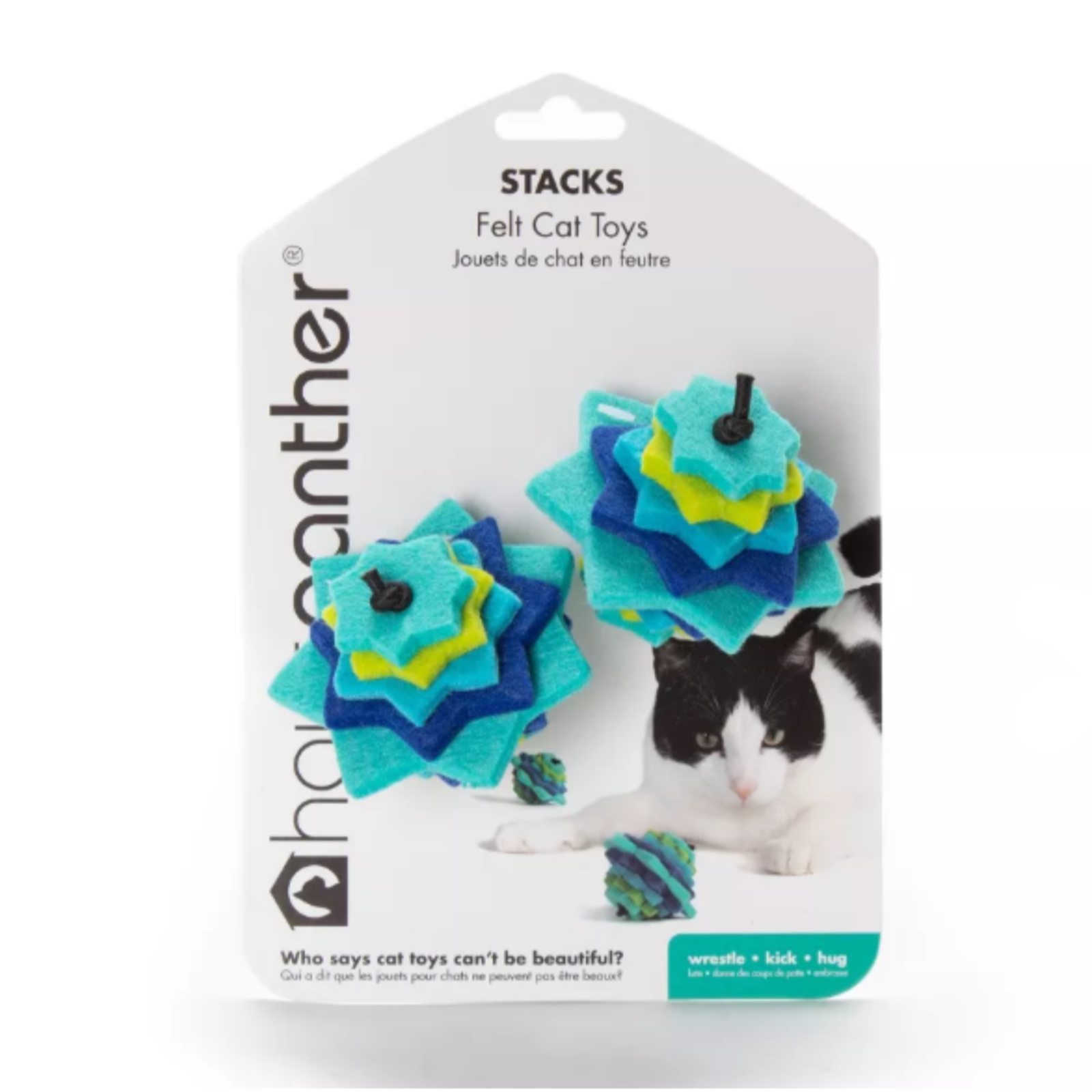 These colorful felt toys go bounding across the floor enticing kitty to stalk and pounce. Once she has ahold, they’re just the right size for wrestling, kicking and hugging. Cats love the felt texture and you’ll love the fun colors and abstract shapes that look great in your home. Who says cat toys can’t be beautiful?
