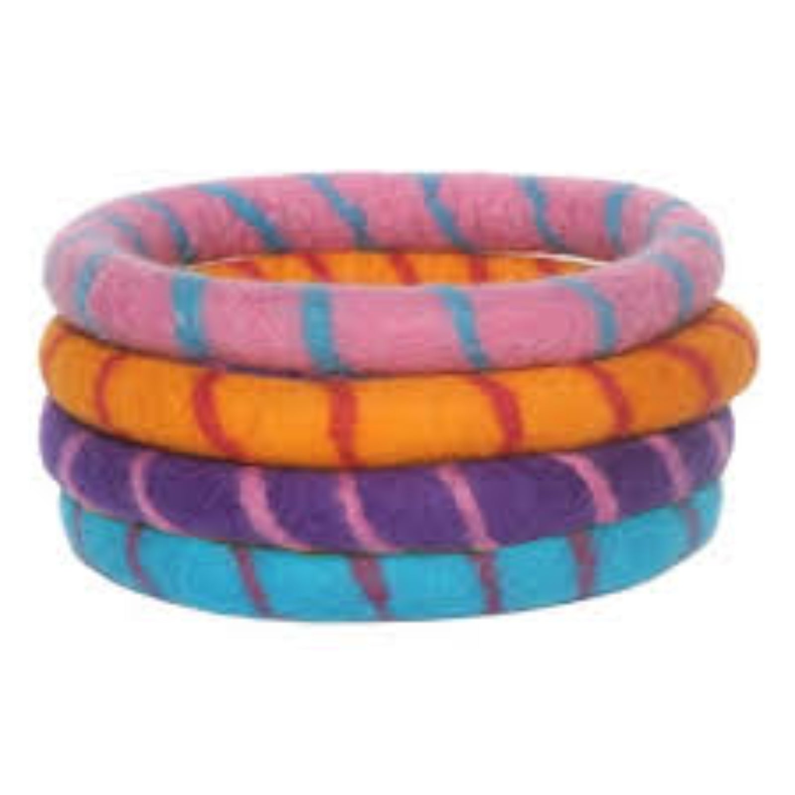 Lollycadoodle 9" Wool Ring Toy is perfect for a game of toss or rug. It's made using 100% wool and brightly colored using natural dyes. Wool is a sustainable and natural source for toys. Lollycadoodle toys are handcrafted in Nepal in a fair trade facility using a felting process that has been used for centuries to create a durable, material that is odor and dirt resistant. Colors Vary.
