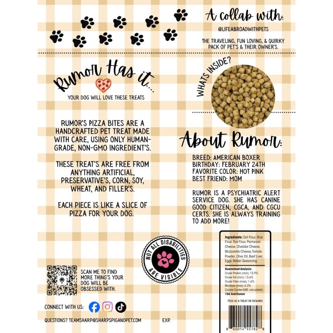 Discover Sharps' exclusive treats created in partnership with @lifeabroadwithpets, featured on TikTok and Instagram. Get to know Rumor and her adventurous family through these specially crafted Pizza Slices Treats.