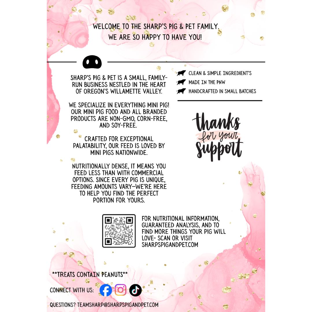 Discover the complete Sharp's experience with this curated sample pack. Get a taste of everything your mini pig will love: a full pound of Sharp's premium mini pig food, plus our signature treats including Hogs n Kisses, Piggy Pies, Piggy Butter Burst, and Chopped Pumpkin. This collection showcases the nutritional quality and variety that makes Sharp's the trusted choice for mini pig owners. Perfect for trying our full product line before committing to larger sizes.