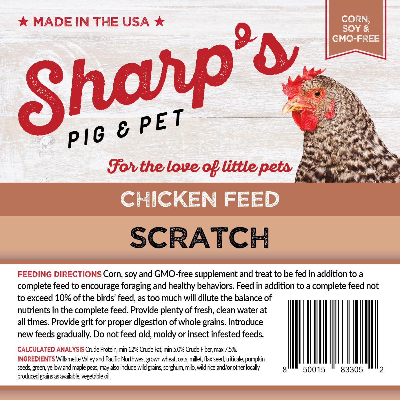 Sharp's Scratch -- stands above other scratch grains- It's built in rich harvest we enjoy here in the Pacific Northwest. We use a variety of locally grown crops and seasonally available ingredients, including wheat, groats, triticale, millet, flax, maize, pumpkin seeds, sunflower seeds, sorghum, milo, wild rice, other native seeds, yellow, green and maple peas. All Non-GMO, of course.